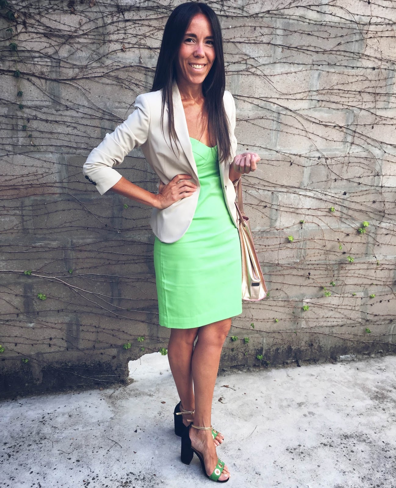 Mi color elegido hoy, verde de la cabeza a los pies, un color que me energiza y me remonta a mis vacaciones, lo cortamos con un lindo saco italiano en los tonos beige y contrastamos con bolso rosa metalizado.